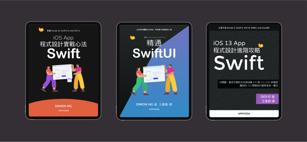 包含《 iOS 14 App程式設計實戰心法》、《iOS 13 App程式設計進階攻略》以及《精通 SwiftUI》電子書。